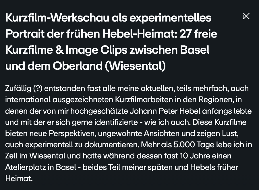 Diese Kurzfilm- und Clipsammlung umfaßt zur Zeit 27 Arbeiten und ist etwa 90 Minuten lang. Gerne möchte dieses Programm im Hebeljahr 2026 auf einer Leinwand präsentieren. Hier der direke Link: https://vimeo.com/showcase/12157125